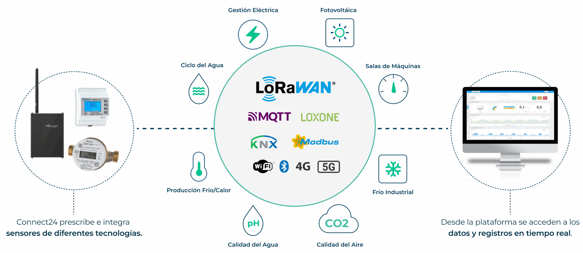 Connect24 combina la implementación de sensores con las integraciones directas a plataformas de terceros vía API, logrando una digitalización flexible y escalable.